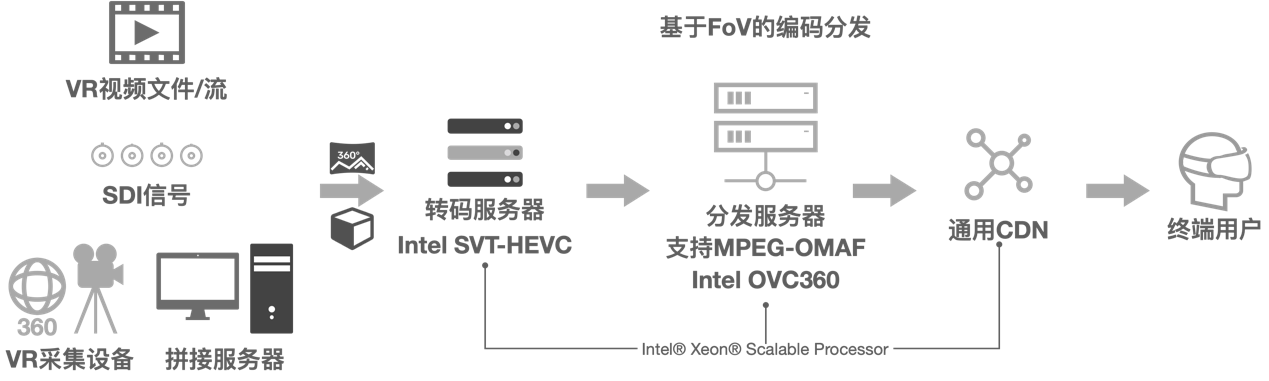 采用了英特尔的SVT-HEVC技术,基于HEVC的Tile编码标准,可实现8K 60fps的实时编码,将VR视频分割成多个独立编码的Tile,终端设备只需根据需求选择Tile区域,进行解码渲染,有效减小带宽和解码压力。